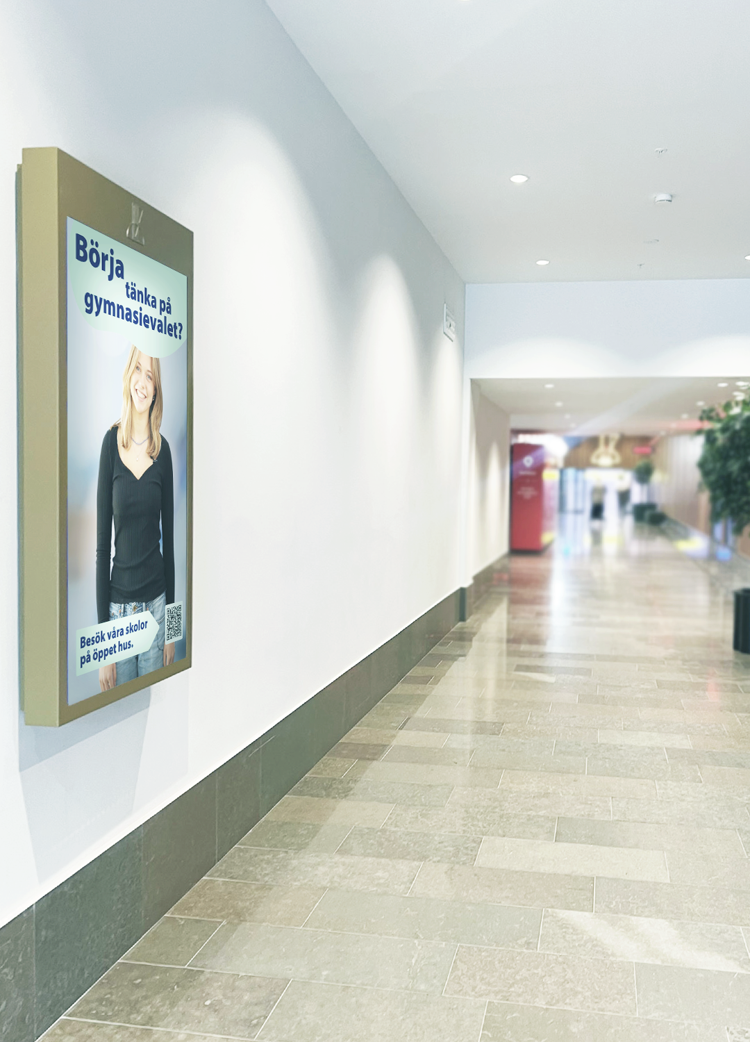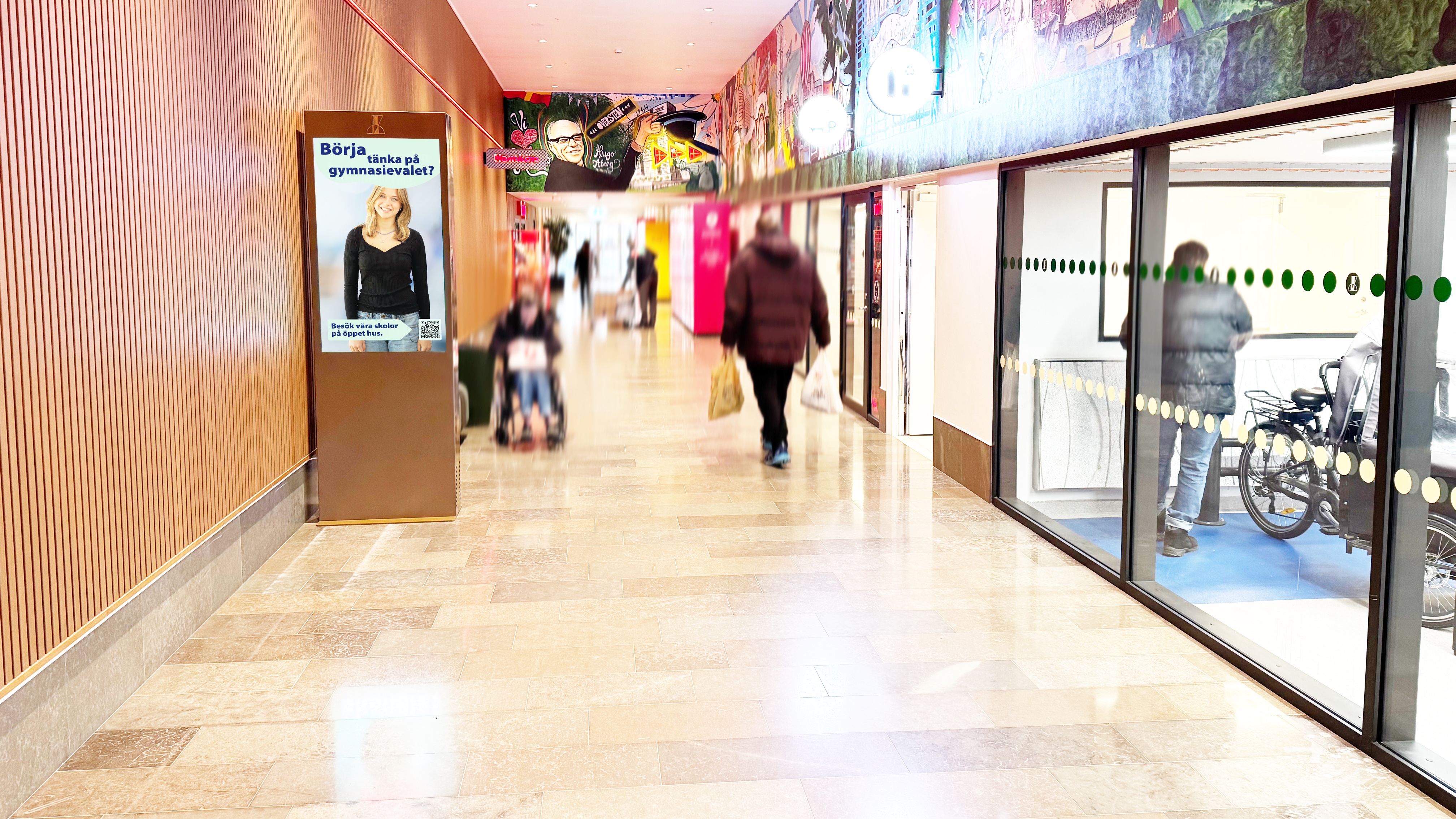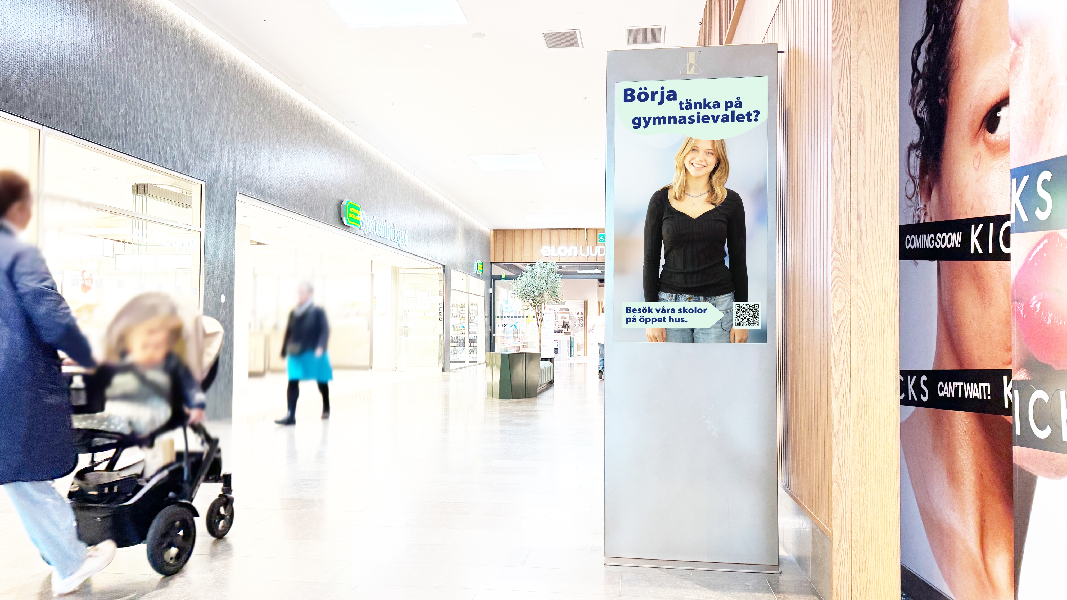 Ni syns på 8 st skärmar (55 tum) i stående format som är placerade runt om i köpcentrumet.